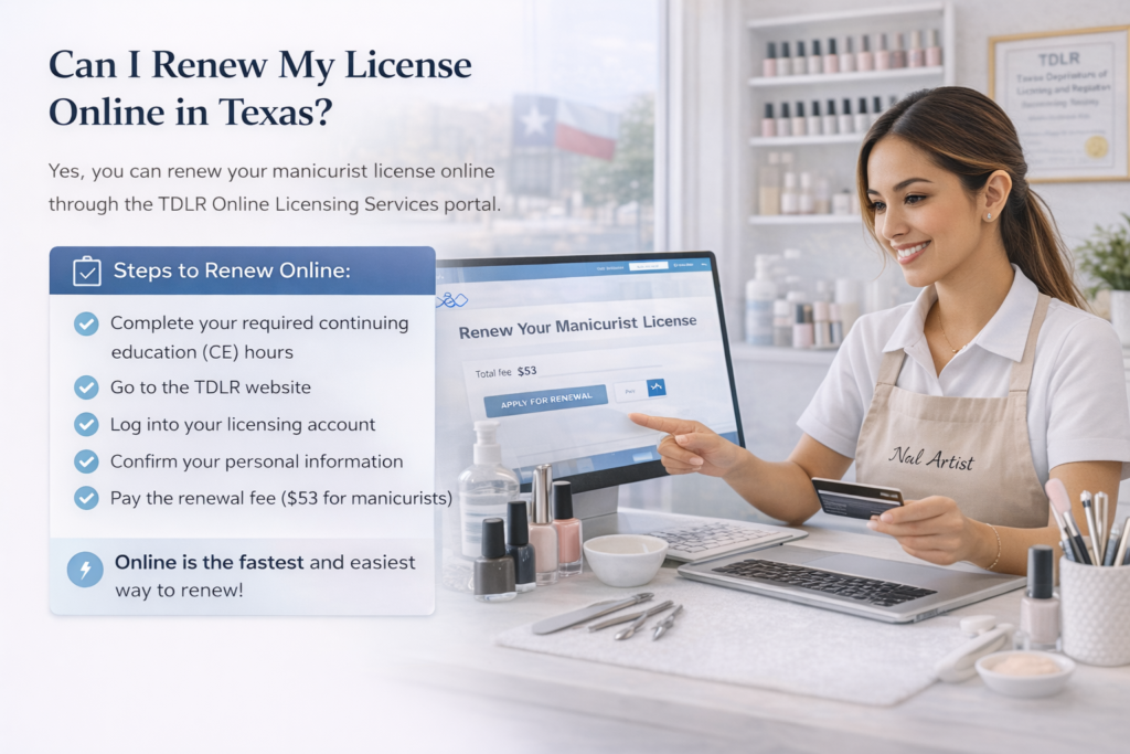 You can renew your manicurist license online through the TDLR Online Licensing Services portal.